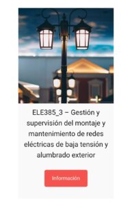 Las redes eléctricas en baja tensión son de los cursos más especializados en nuestra web y cuenta con variedad de temas desde la supervisión o seguridad hasta la gestión en el montaje o mantenimiento para su correcto funcionamiento. La unidad formativa UF1629 tiene una duración de 90 horas y trata la gestión del montaje en redes de BT. Está formada por un total de seis competencias que formarán al alumno a montar y saber cómo funcionan las redes eléctricas de baja tensión.