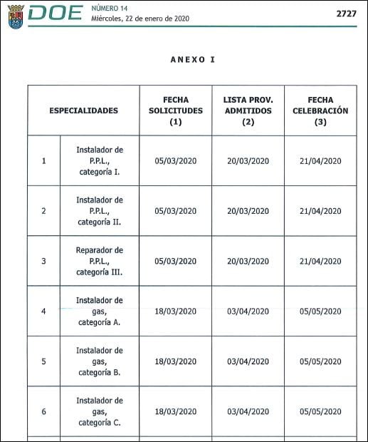 La fecha límite de inscripción para el examen de Instalador de Gas en Extremadura para la convocatoria de 2020 es el 18 de marzo de 2020